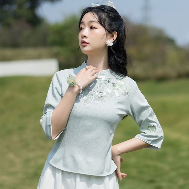 唐装文芸立襟改良茶服七分袖刺繍上着ウエストスカート2点セット