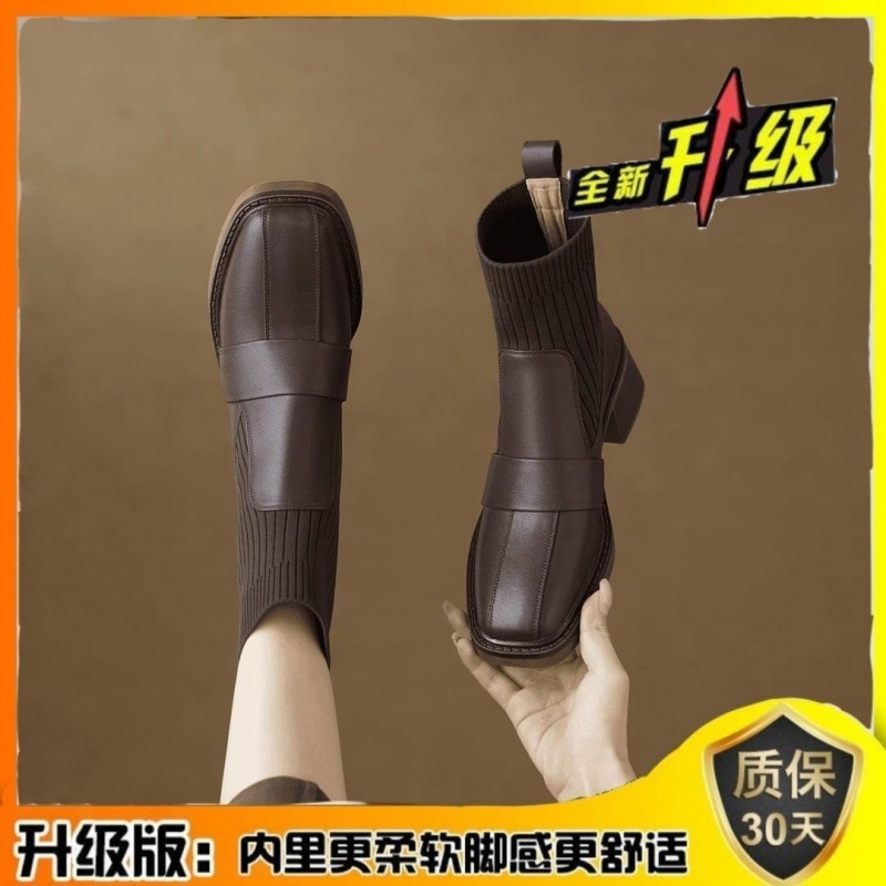 太ヒールのニットのショートブーツの女性の2024秋冬の新型のハイヒールのやせている靴の百合英倫風のマーティンの靴の弾力性の靴下の靴