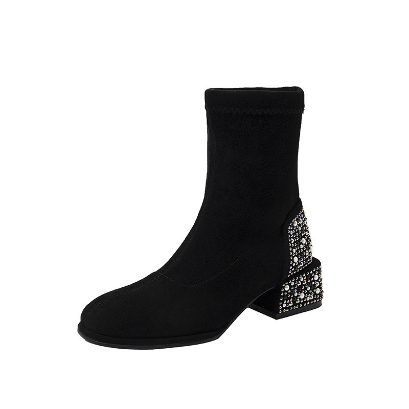 2024秋冬の新型黒の角のやせた靴の優雅な真珠のドリルの太さとスエードの靴の女性のショートブーツの組み合わせ