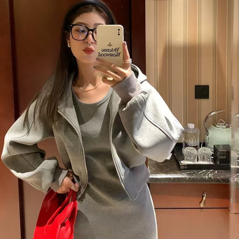 グレーのカジュアルな帽子付きのパーカーは痩せています。