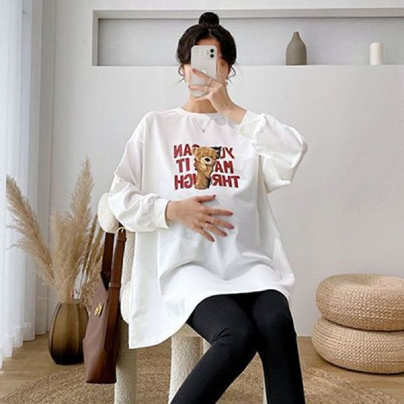 純綿の中長の妊婦の長袖のtシャツの女性の漫画のプリントの秋の底のシャツの大きいサイズのゆったりした丸首のパーカーの潮
