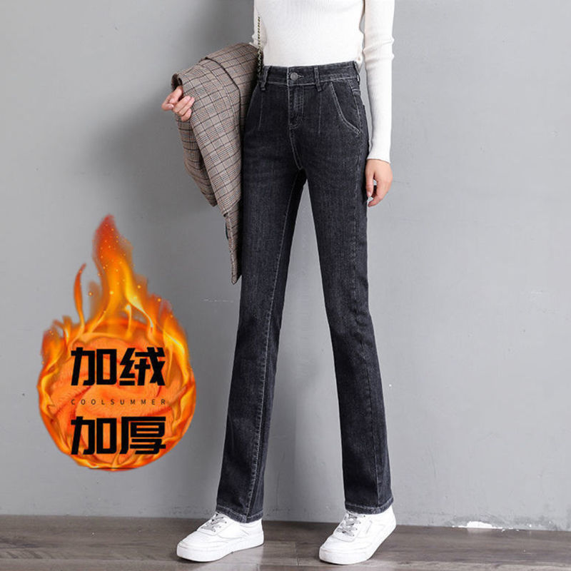 大きいサイズのゆったりしたストレートジーンズの女性は腰が高くて痩せています。