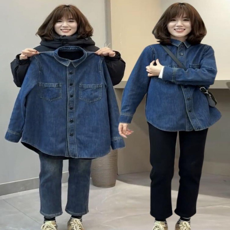 太ったm 300斤の特大サイズの新しい中国式の復古盤は偽の2つのデニムの上着の女性の2024春の新しい6を掛けます。