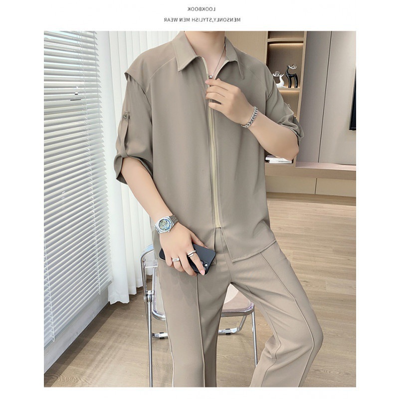 夏の高級パーマフリーアイス半袖カジュアルシャツ男性2点セット