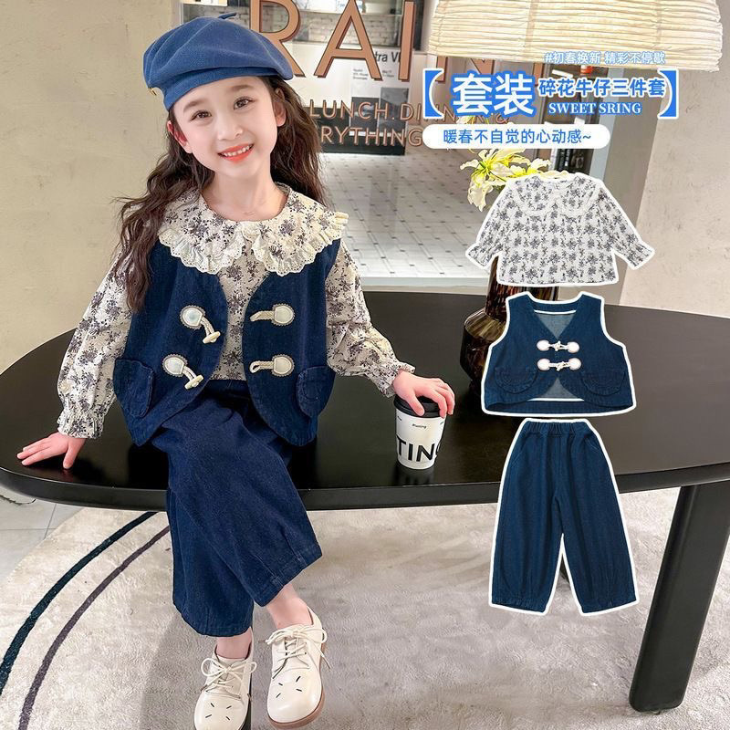 少女カウボーイ砕花シャツセット中国風春秋モデルの新型洋気流行児童三点セット服