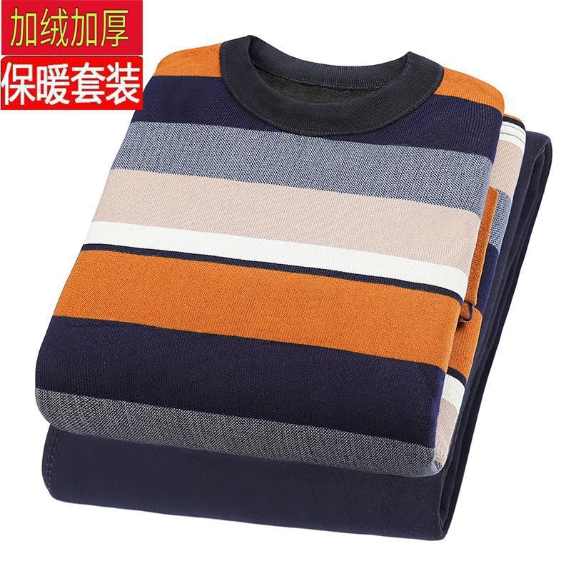 中高年保温服男性セットにベルベットをつけて、お父さんは丸首を入れて防寒綿のセーター秋のズボンを着ることができる