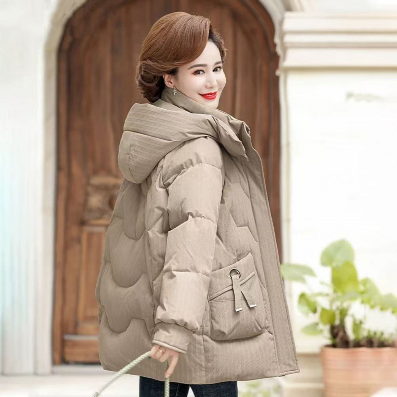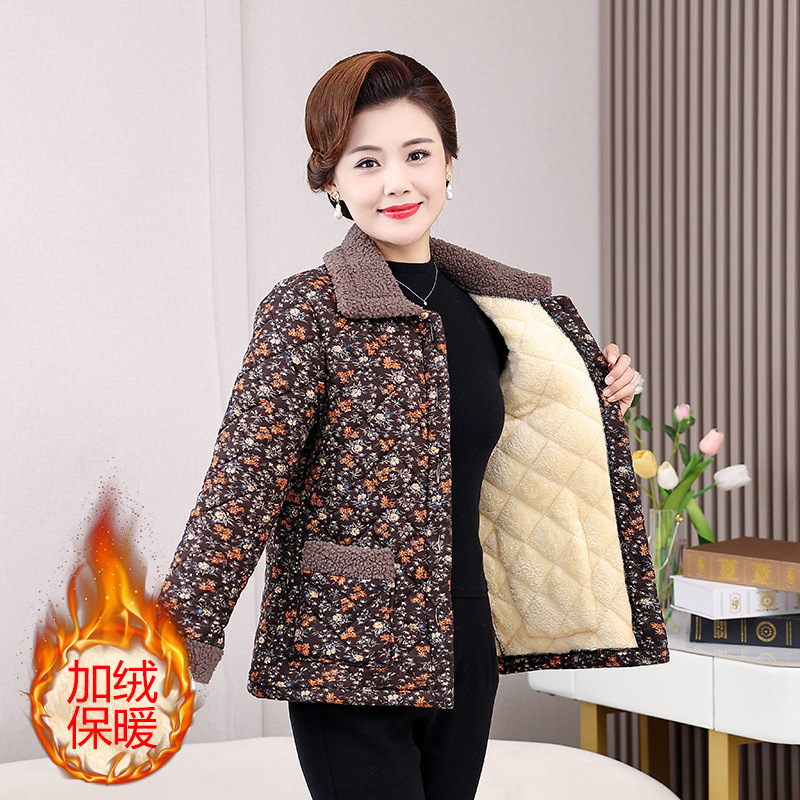 高齢者秋冬加毛保温綿入れの女性の短い色の綿入れの上着の洋風のお母さんは防寒して厚い綿入れの服を着ます。