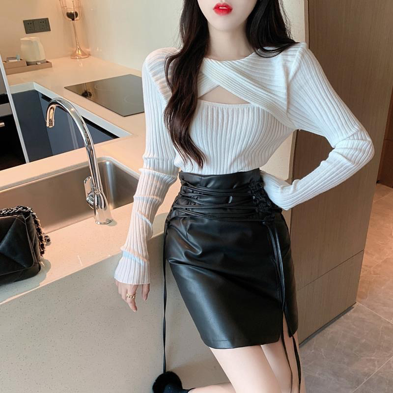 厚いセーターの注意機の透かし彫りの底のシャツの女性の秋冬のメリヤスの上着の高い腰のひものpu皮のスカートの2枚