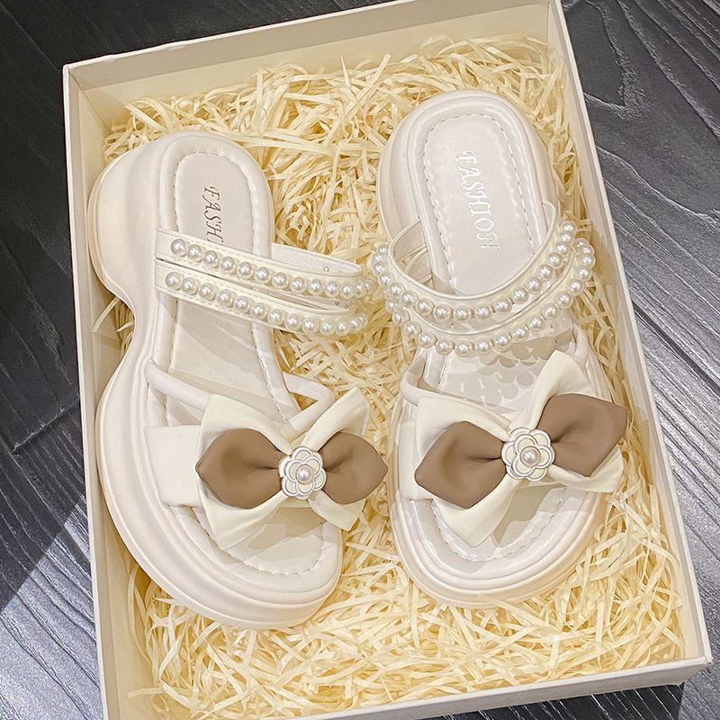 スカートの真珠のサンダルの女性の夏の外は2024の新型の蝶結びの厚い底を着て高くなります。