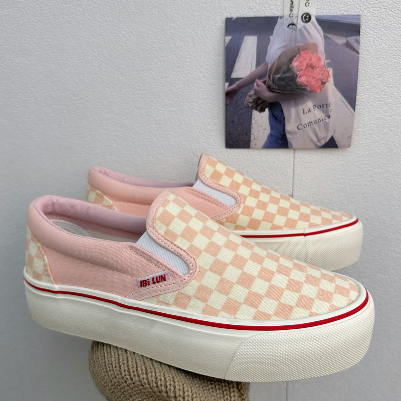 厚い底の韓国の街は厚い底の白黒の碁盤の格子のキャンバスの靴の女性をたたきます。