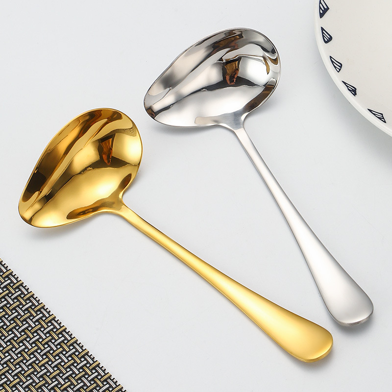 304非磁性ステンレスソーススプーン卸売りホテルの厚い汁の殻に汁をかけてニンニクのアヒルの口の鍋のスプーンをかけます。