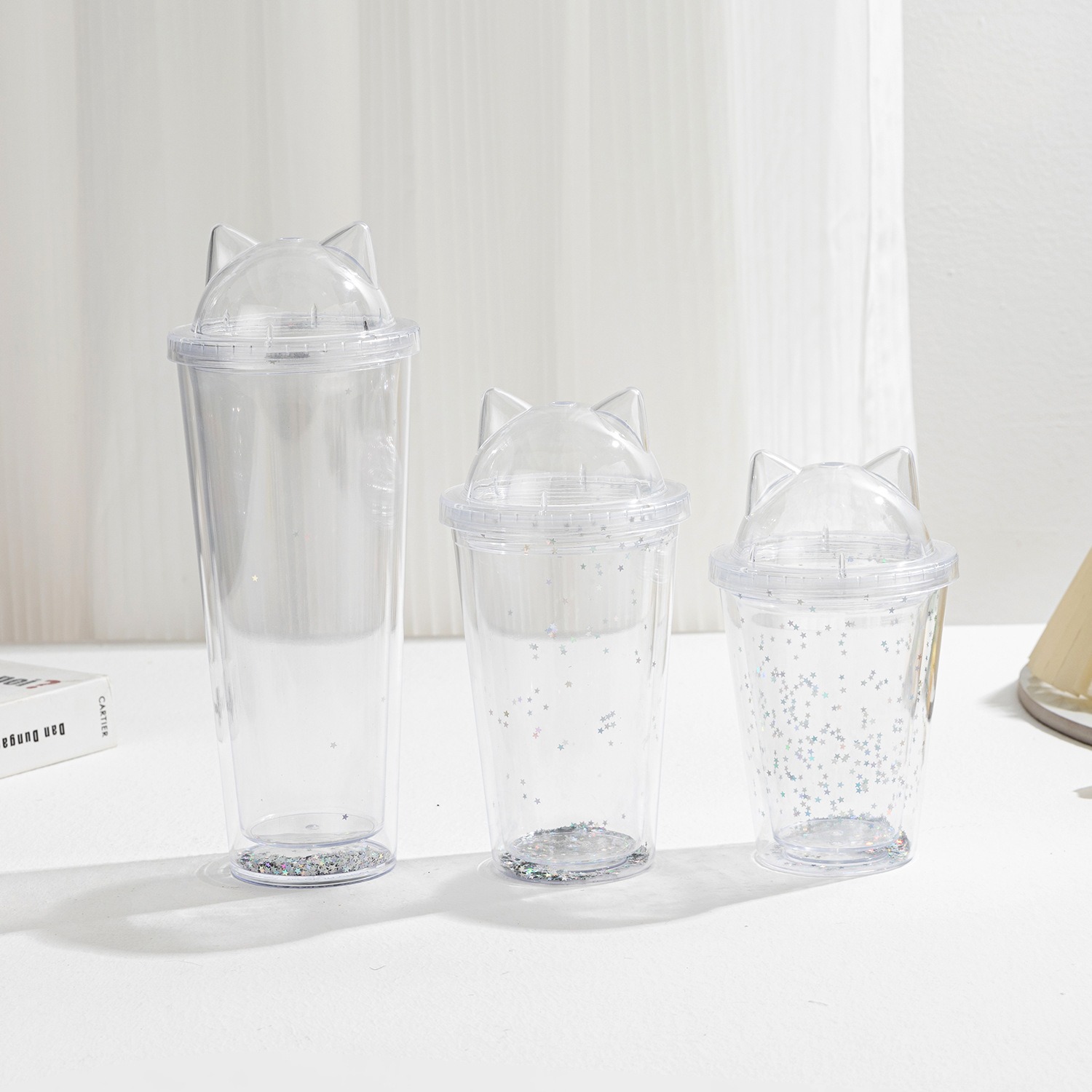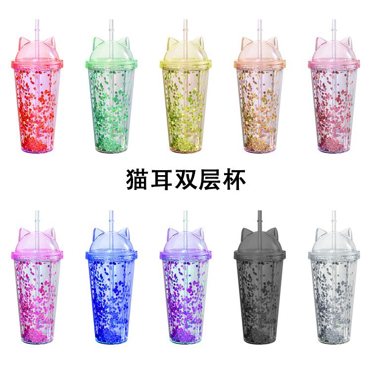厂家定制双层塑料吸管杯双层猫耳吸管杯猫耳朵亮片闪片杯随手杯