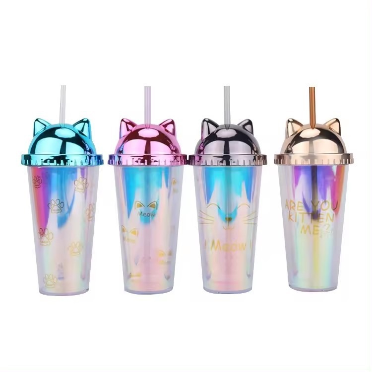 厂家定制新款猫耳朵双层塑料吸管杯电镀盖亮片卡通猫耳杯便携吸管