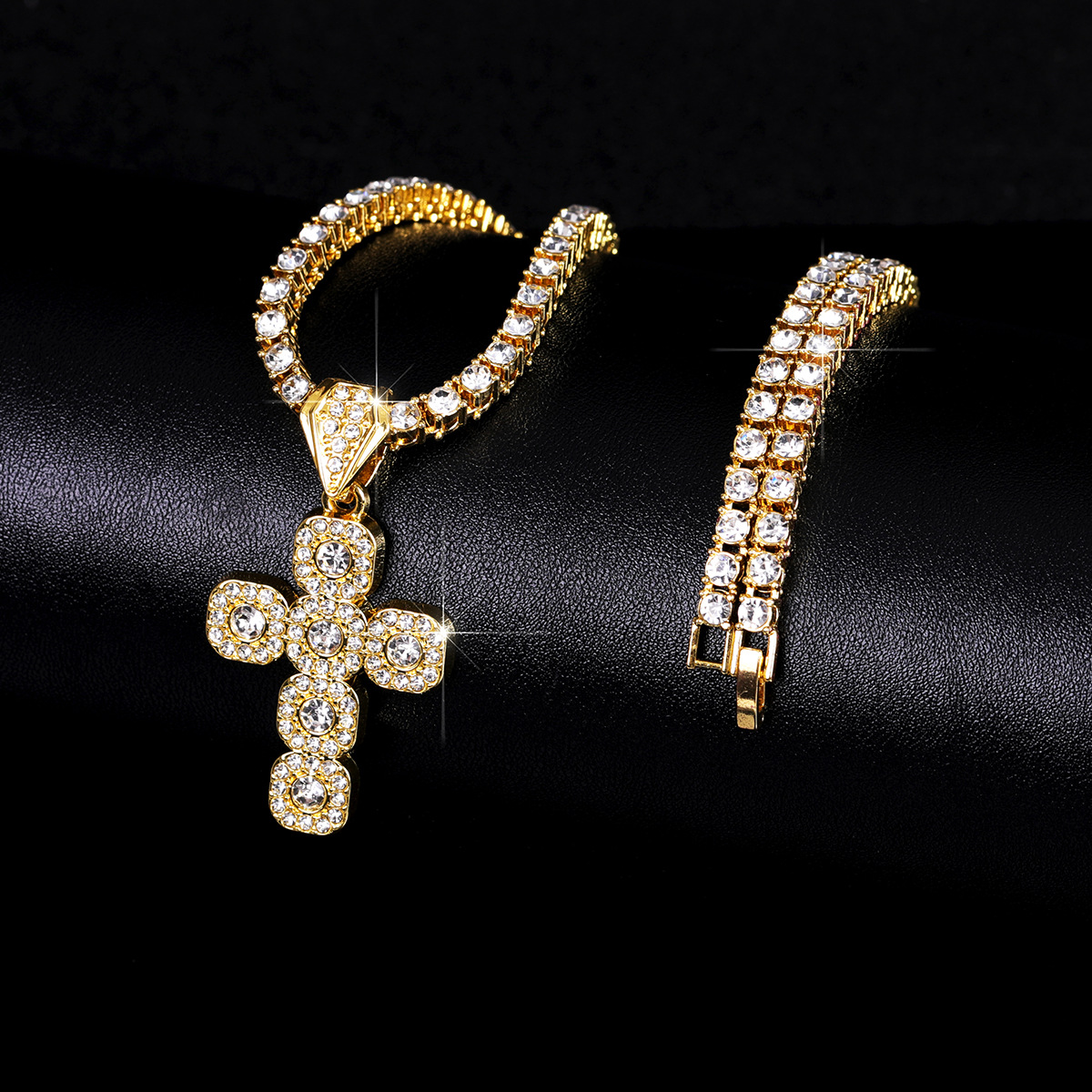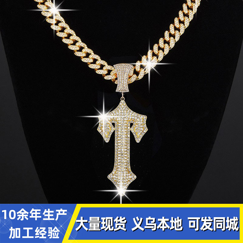 ヨーロッパとアメリカのファッショナブルな個性、多用途のヒップホップフルダイヤモンド輝く合金フルダイヤモンドクロス鎖骨チェーンネックレス、男性と女性用