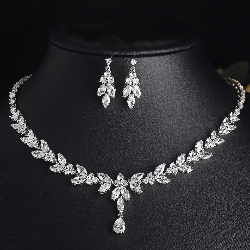 ヨーロッパとアメリカのファッショナブルなシンプルな気質ロングマーキスウォータードロップジルコンネックレス花嫁介添人結婚式宴会セットイヤリング