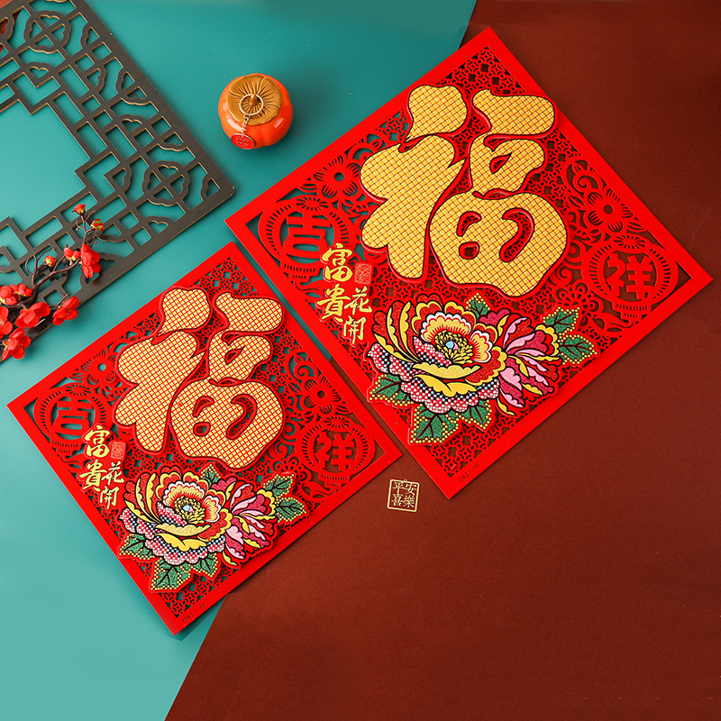 2024龍年新型高級福字門に植毛金粉平面透かし彫り福字旧正月年画用品を貼る