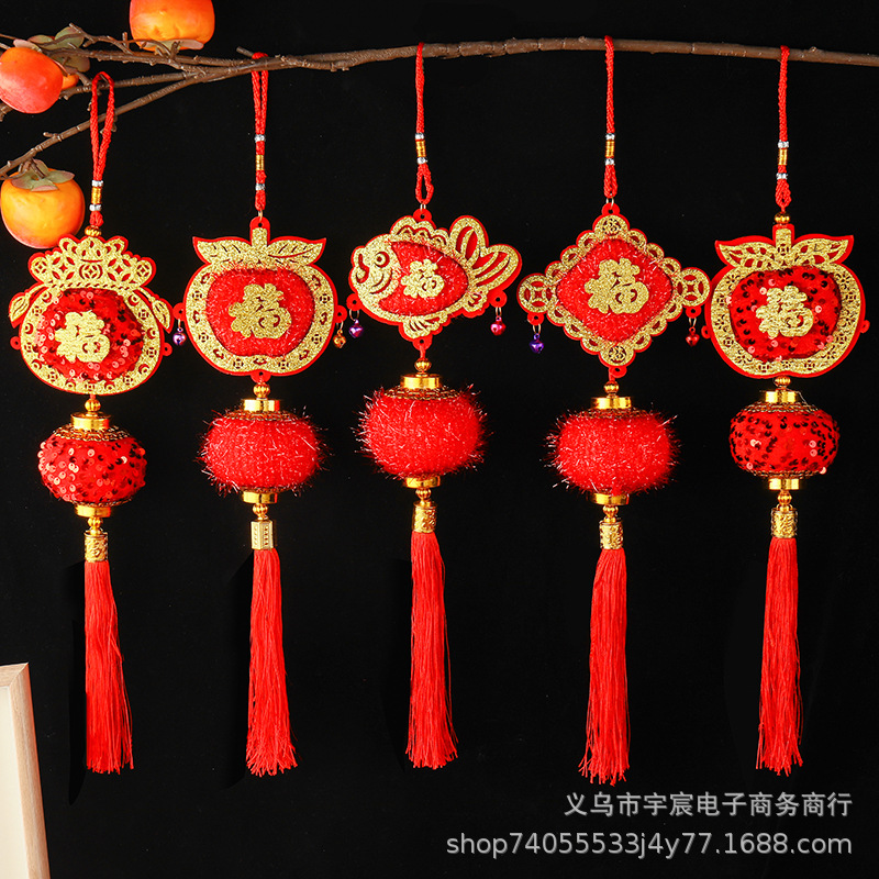 新商品の春節用品の植毛ボールの福袋は中国風の双魚の福の字の祝い事の室内のペンダントの装飾用品を並べます。