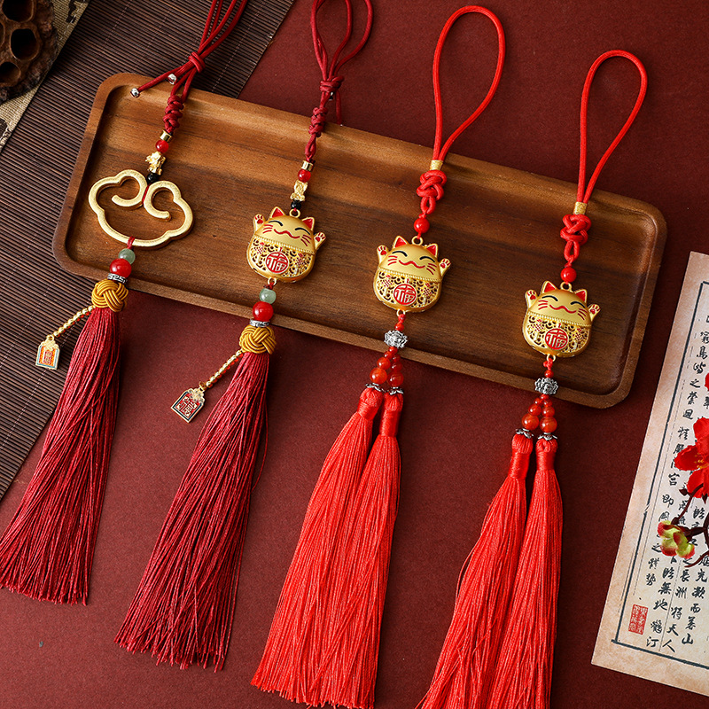 新商品招き猫平安錠赤いフリンジ自動車ストラップバックミラーストラップ車載かわいい猫ストラップ