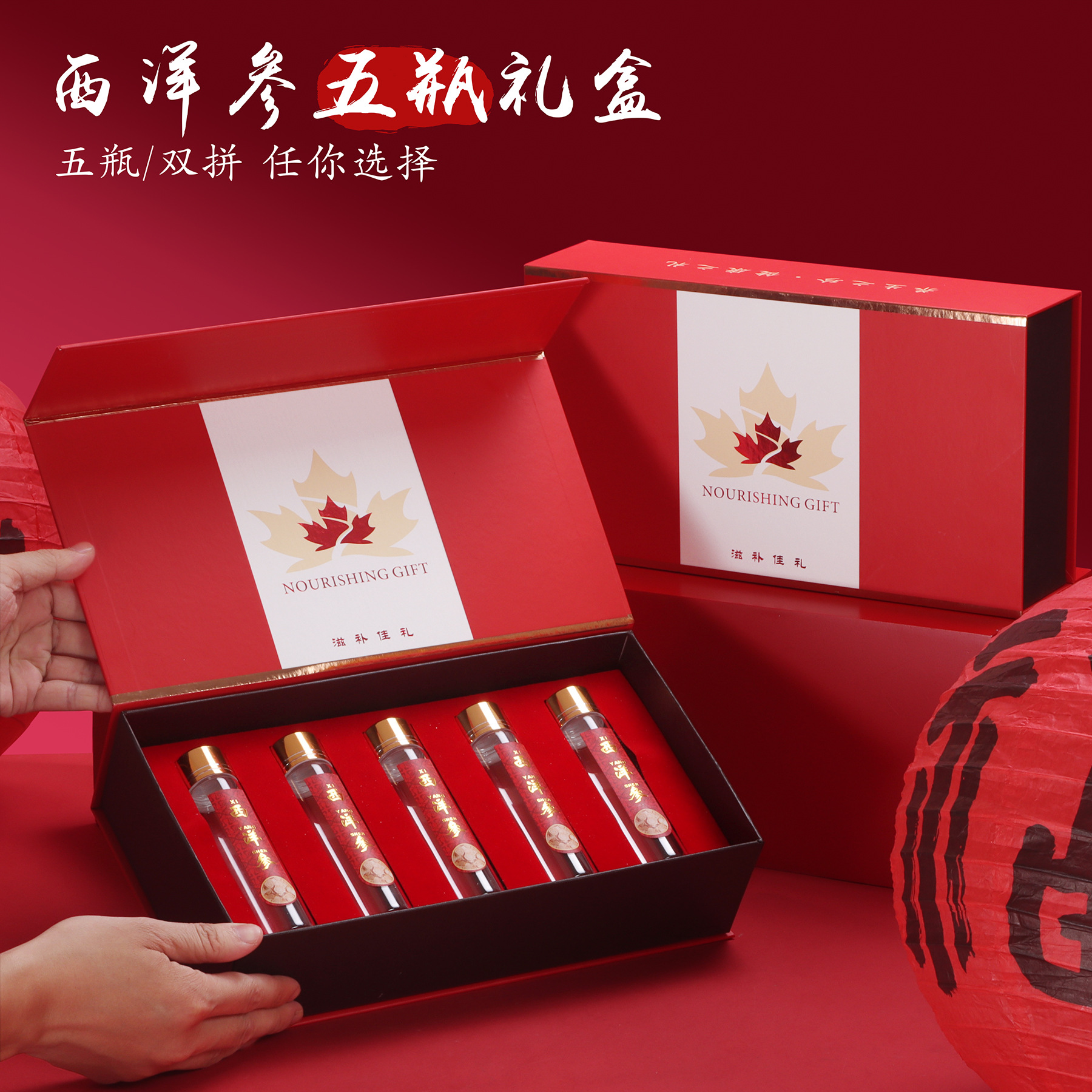滋養補給のための高級ギフト、高級紅葉紅五瓶ダブルギフトボックス、西洋人参入り厚箱ガラス瓶丸箱包装箱