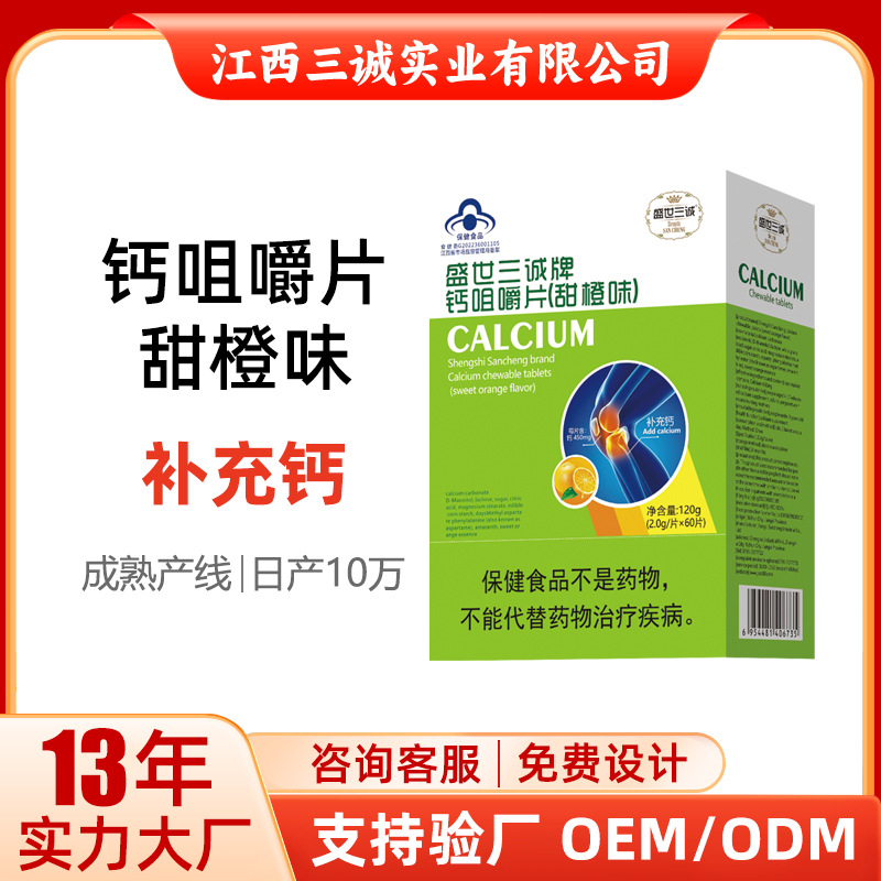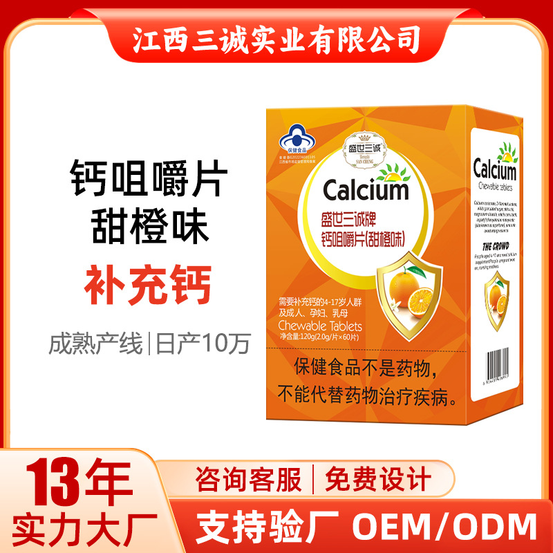 盛世三誠ブランドのブルーキャップの規格品の保健食品のカルシウムの咀嚼片の子供の甘いオレンジの味の青少年はカルシウムの切れを補充します。