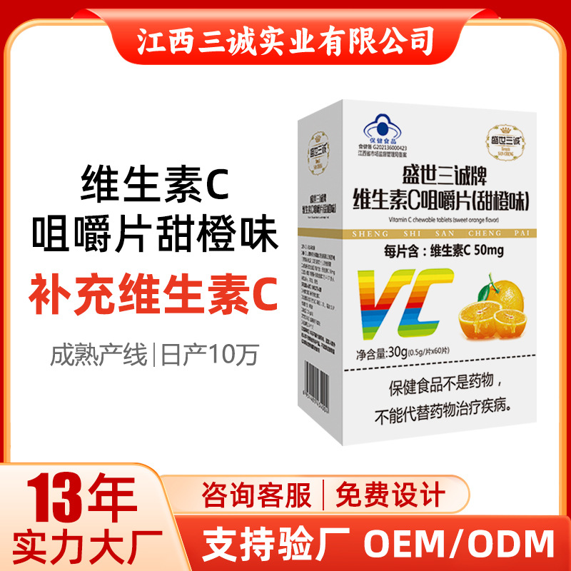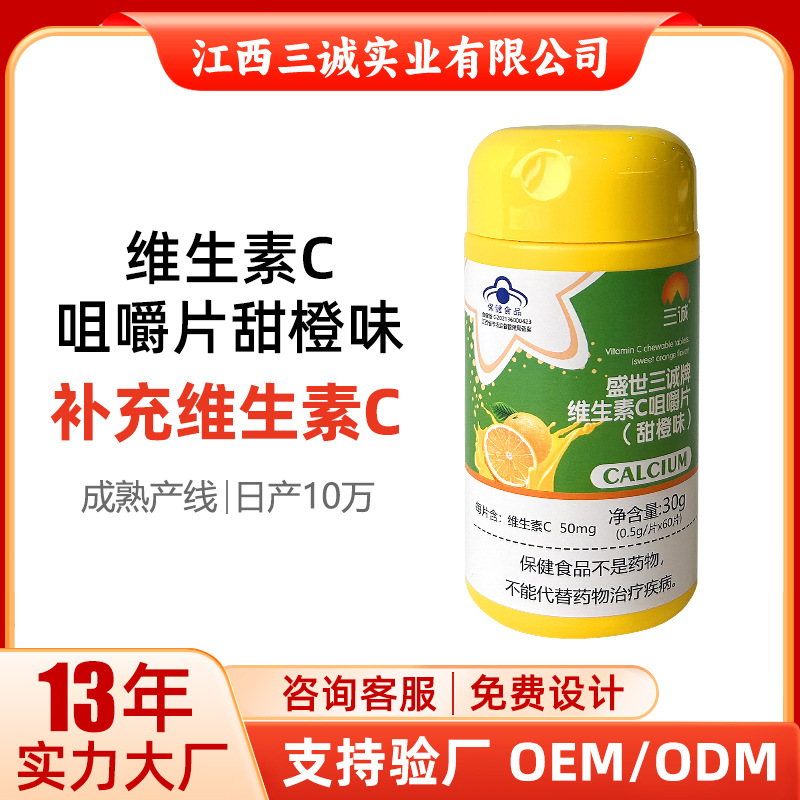 盛世三誠牌藍帽ビタミンc片成人維c咀嚼片甘橙味子供果物味裸瓶