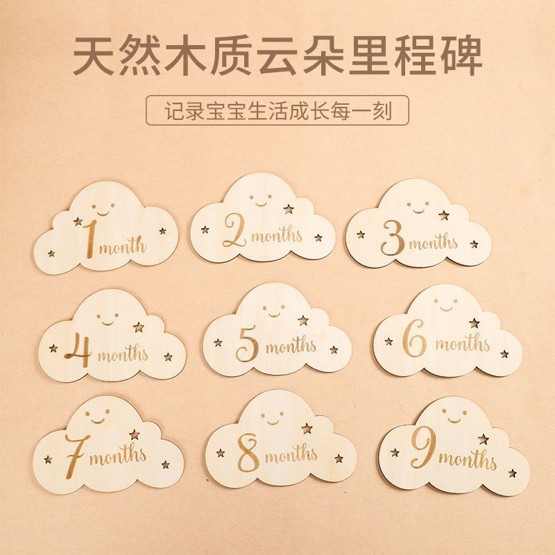 木の雲のマイルストーンの赤ちゃんの成長の記録の写真を撮る背景の道具の赤ちゃんの月のマイルストーンのペンダント