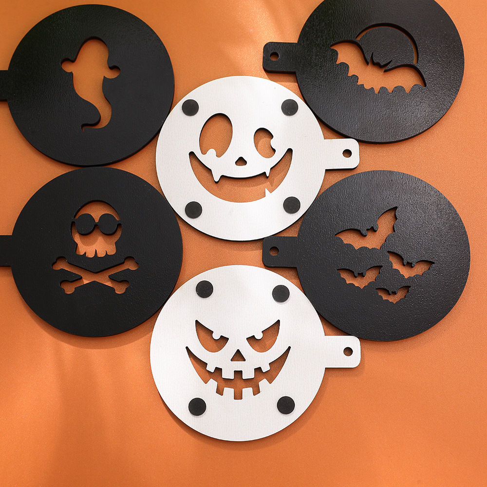 新型木製ハロウィーン透かし彫りコースター6点セット両面印刷白黒ハロウィーン頭蓋鬼顔装飾マット
