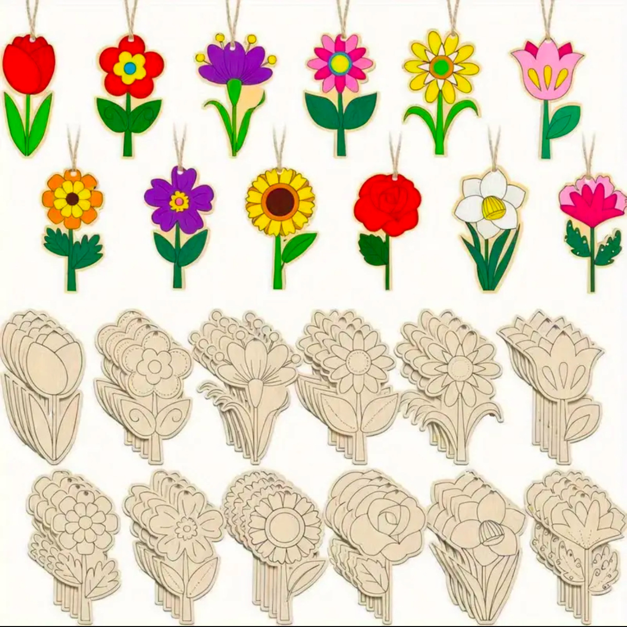 48ピース木の春の花の形の子供のDIYの花木のペイント工芸品木の雕刻の花の装饰