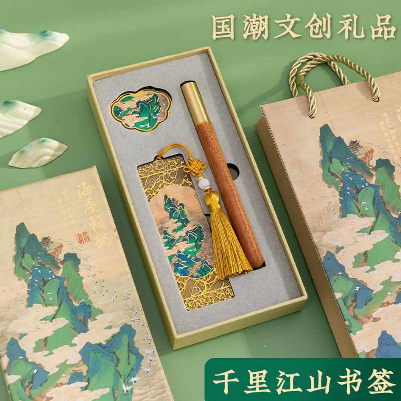 千里江山図ブックマーク礼箱セット古典中国風プレゼント金属真鍮ブックマーク高級精緻記念