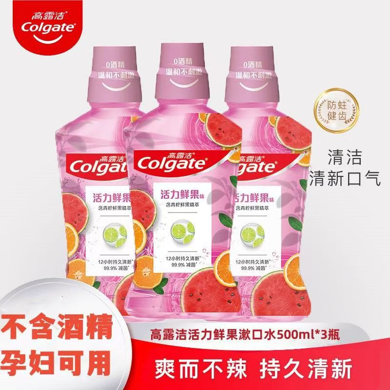 ショッピングモールで売られている高露潔フレッシュフルーツマウスウォッシュ、フッ素配合、アルコールフリー、抗菌、口腔ケア、ゼロ刺激フォーミュラ