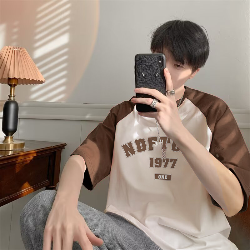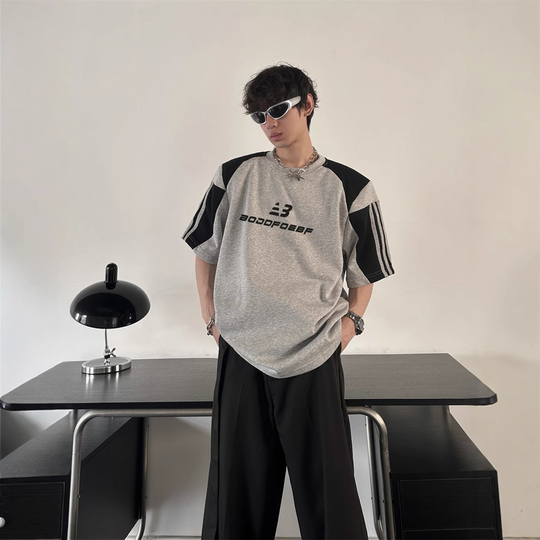 新しい夏のレトロなアメリカのファッションブランドの半袖tシャツの男性2025は色にぶつかって思いやりのある男性の肩の半袖のファッションをつなぎます。
