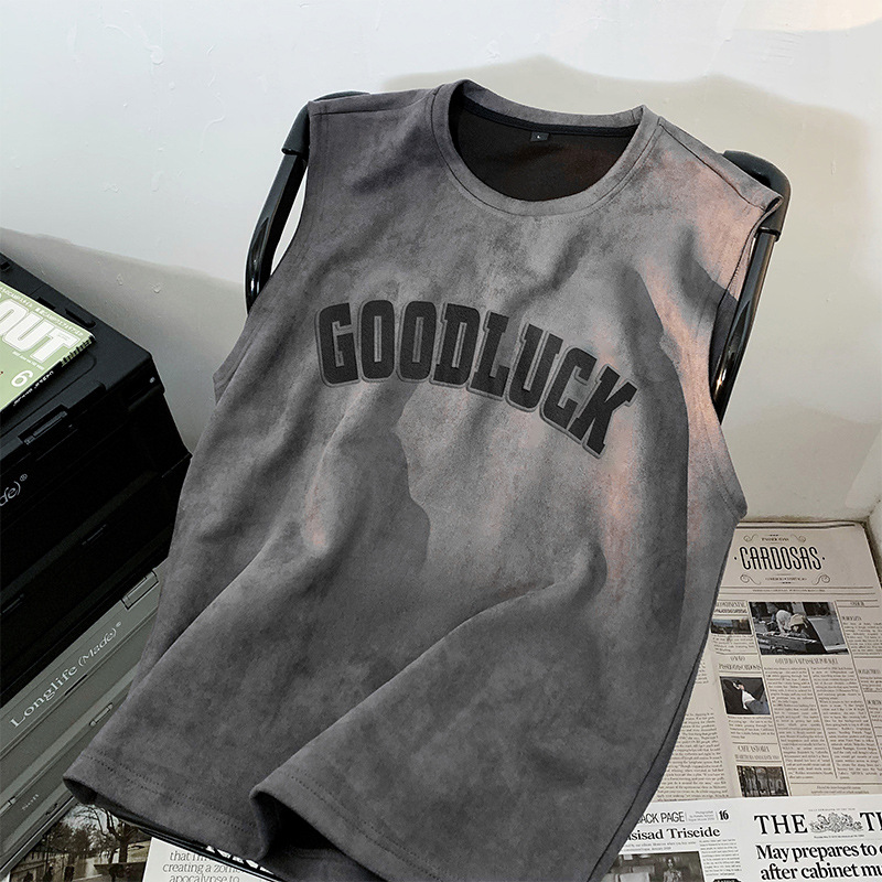 スエードのベストをまねる男性の夏のアメリカのファッションブランドの袖なしのtシャツの男性の金のゆったりした運動のカンカンの肩の重いポンドの半袖