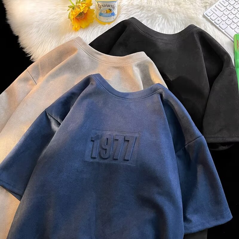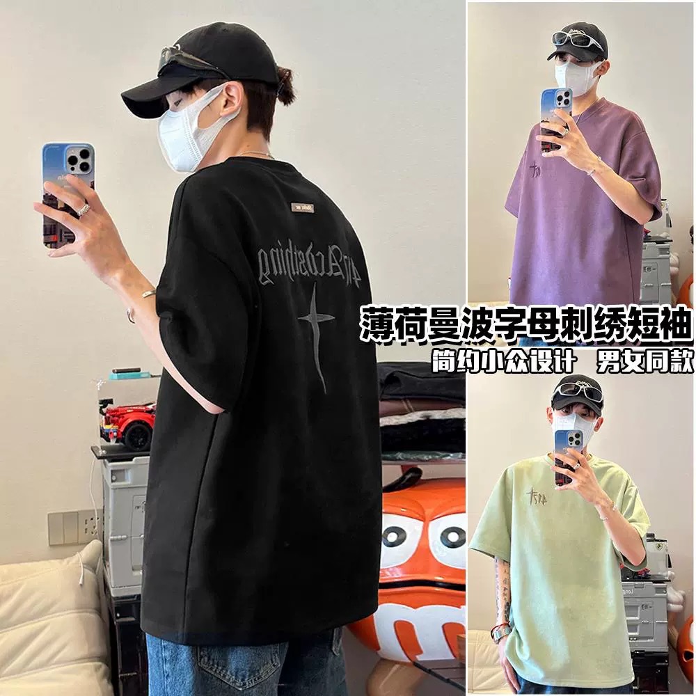 スエード半袖tシャツ男女夏新型アメリカレトロ刺繍重ポンド丸首潮牌ゆるい半袖INS
