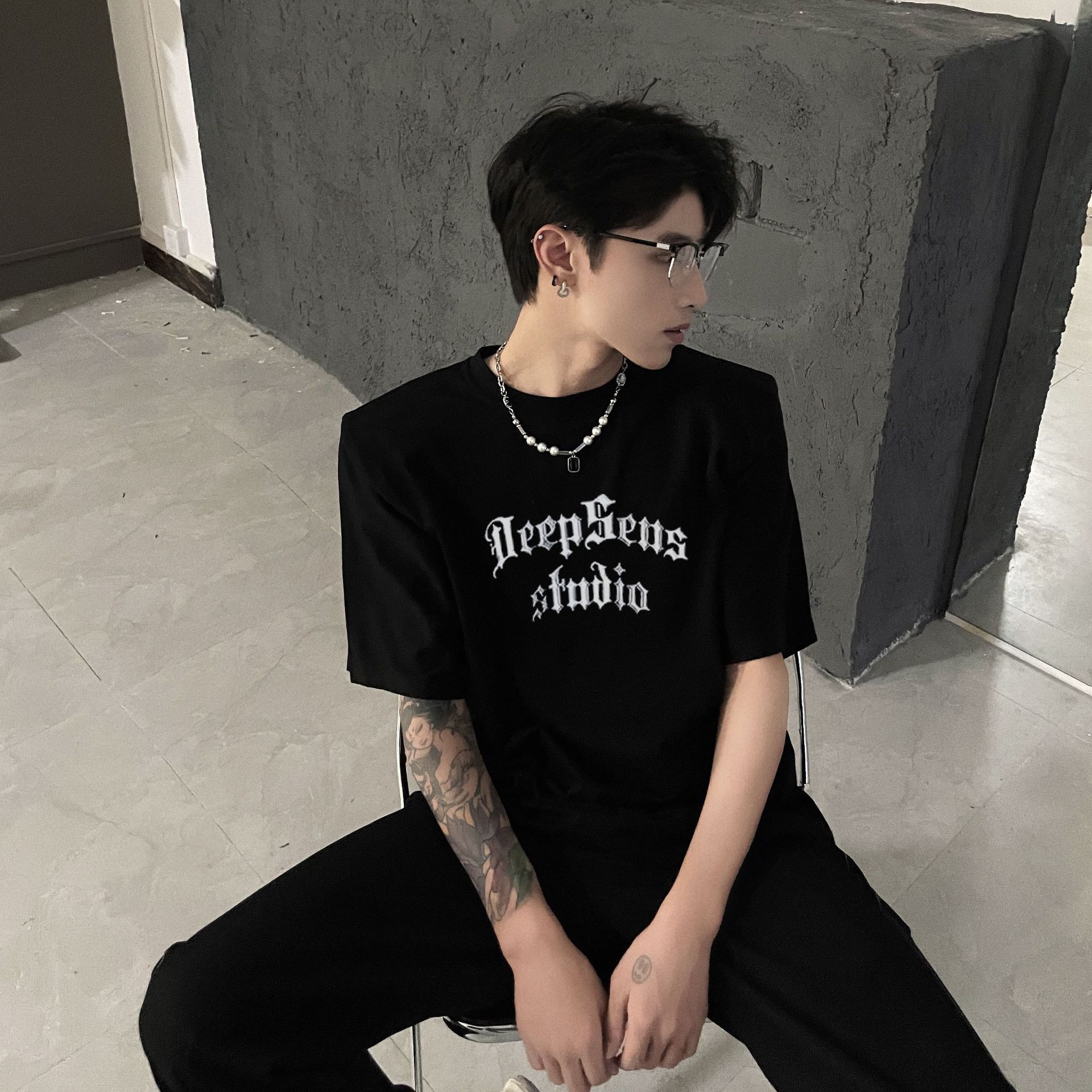 大衆がデザイン感を解きほぐすプリント肩半袖tシャツ男夏ゆるいカジュアル半袖トレンド上着