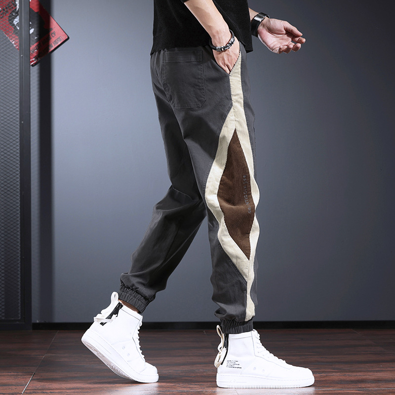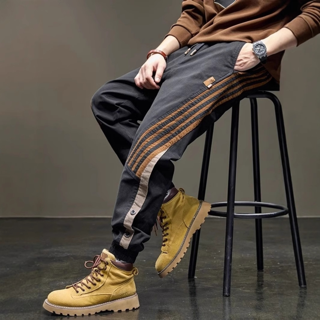 ファッションブランドのストライプが色にぶつかって、男性の秋のゆったりとしたカジュアルパンツをつなぎ合わせます。