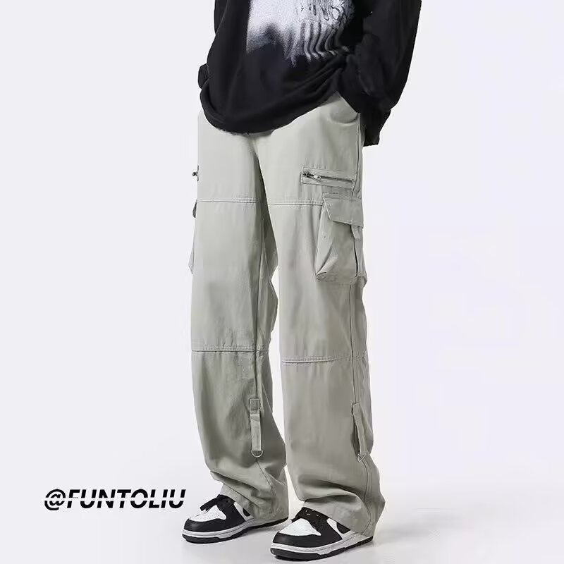 日本系復古工装ズボン男女潮牌高街hiphopモップ感多ポケットストレート広脚カジュアルパンツ