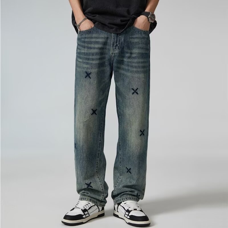 アメリカのレトロなジーパンの男性の2024秋の新型の水洗いジャカードのcleanfitズボンはまっすぐなズボンを修理します。