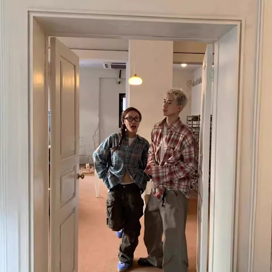 2024レトロ衝突色格子縞長袖シャツ男女春秋潮牌ゆるいカジュアルカップル工装シャツコート