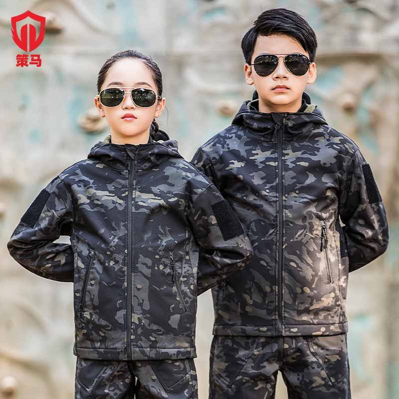 子供の迷彩サメの皮の突撃服の男性秋冬の新型のベルベットのジャケットと帽子の保温冬のキャンプ服
