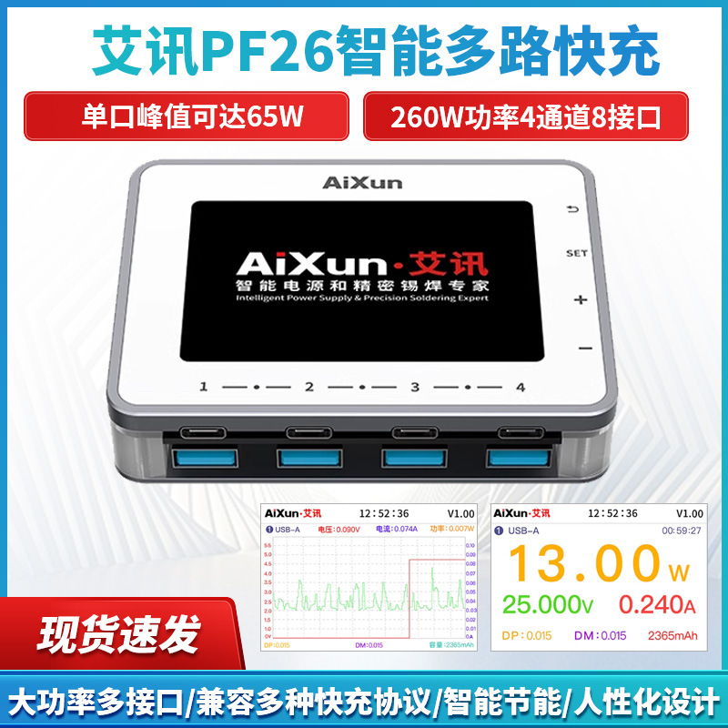 艾訊PF26知能多重充電4チャンネル8インターフェイスはPD/QC/AFCプロトコル曲線電流電圧と互換性がある