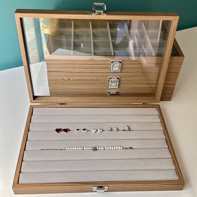ウォールナットカラーリング収納ボックス透明ガラスネックレスジュエリーボックスチェック柄ブレスレットペンダント仏ビーズ収納ボックス