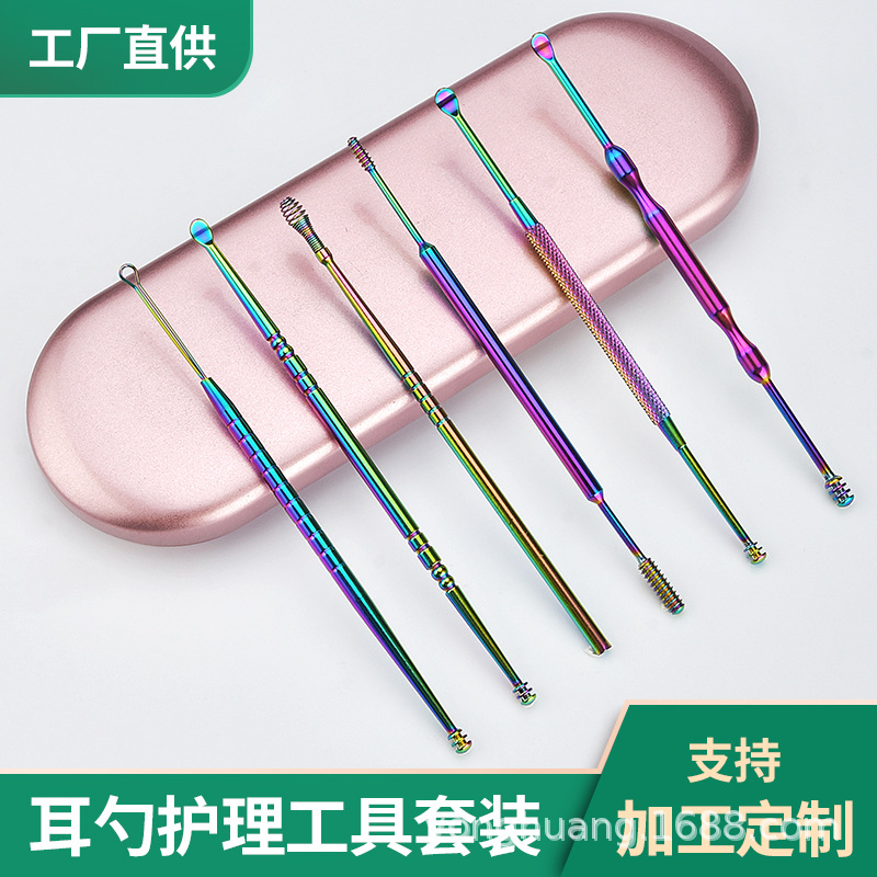 工場でカスタマイズ可能なステンレス製カラーチタン製耳かきツール6点セット、耳道清掃用耳かきツールセット