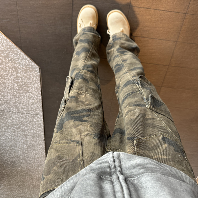 大きなポケット迷彩オーバーオールメンズ春と秋アメリカンハイストリート脚長ランニングパンツアウトドアスポーツストレートパンツ