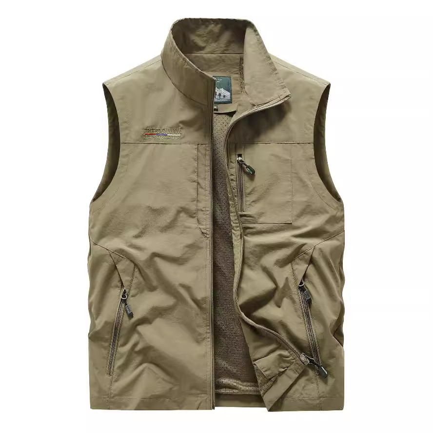 春の新型カジュアル通気性ベストアウトドア撮影釣りスポーツ男性カーディガン立襟ロゴ肩