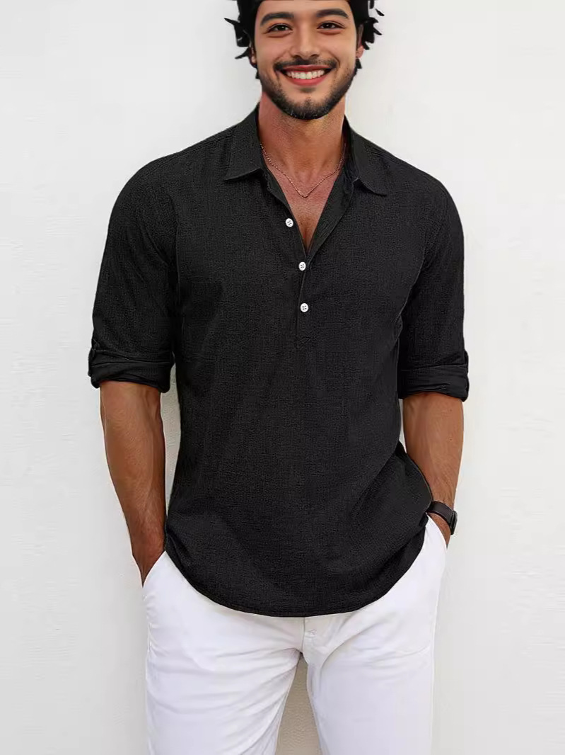 国境を越えた新型欧米男性式純色シャツ青少年家庭レジャーファッション襟シャツ綿麻上着