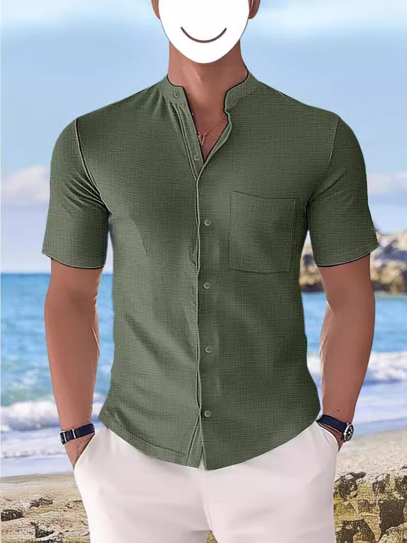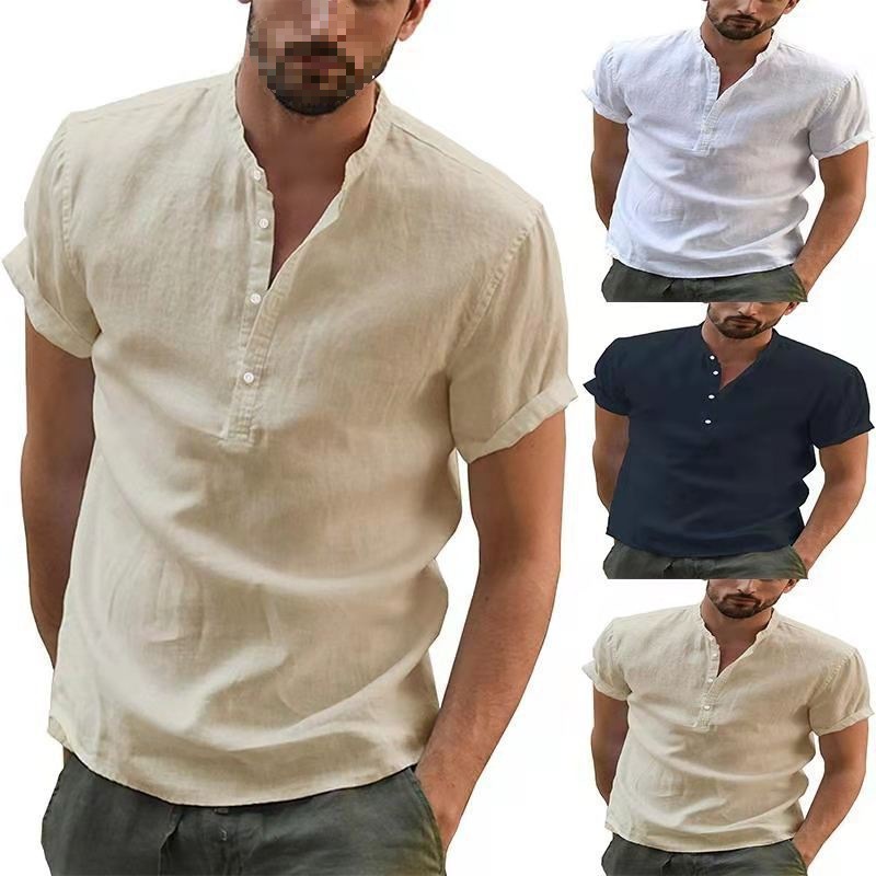 国境を越えた夏の男性ヘンリー襟純色綿麻カジュアルシャツビーチゆるいユーロ半袖プルオーバーシャツ