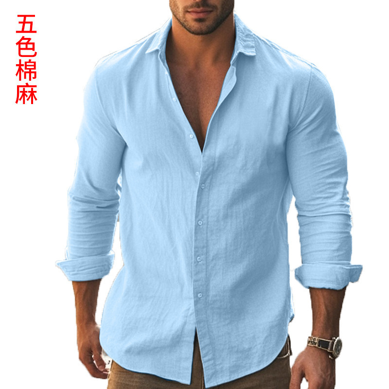 欧米クロスボーダー2024新型カジュアル純色長袖シャツ綿折り襟系長袖ビーチシャツ上着男