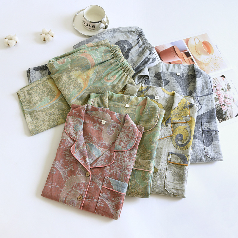 色織りジャカード綿ガーゼパジャマ女性四季国風薄い襟カバー9分袖ズボンホーム服