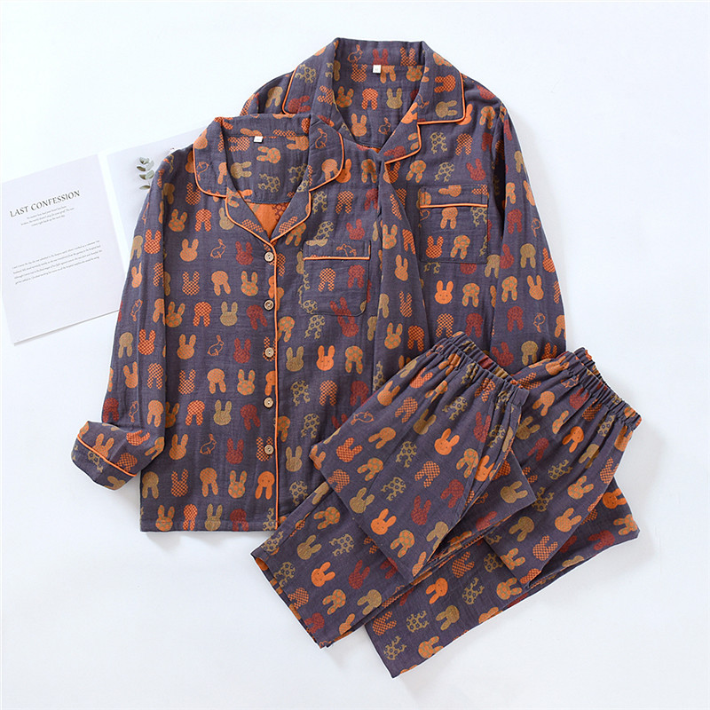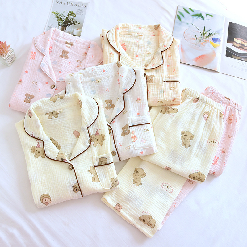 新商品の純綿二重ガーゼパジャマ女性夏春と秋の薄い綿100% クレープ長袖襟付きホームウェアセット