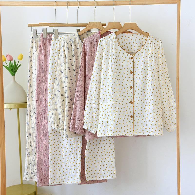 新商品の純綿二重ガーゼパジャマ女性夏春と秋の薄い綿100% クレープ長袖襟付きホームウェアセット